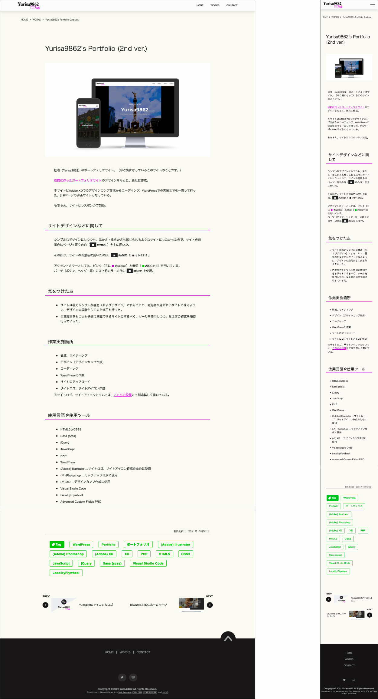 Yurisa9862のポートフォリオサイト制作を行った。AdobeXDを使ったデザインカンプ制作から、コーディング、WordPress化作業、サイトのアップロードまでを実施。使用言語やツールは、HTML5&CSS3/JavaScript/jQuery/PHPなど。