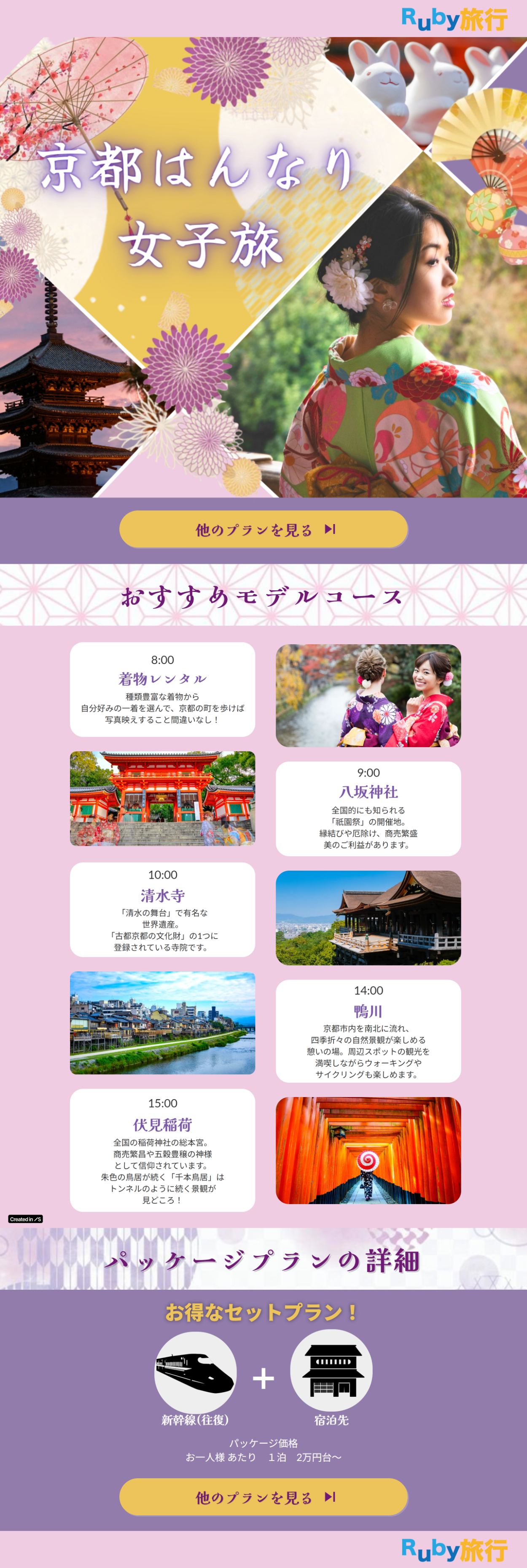 LPでは女性の方に楽しんでいただける京都旅行モデルコースを紹介し、パッケージプランの検索ページに誘導するLP作成