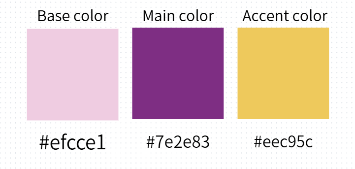 20代後半~40代の女性が好むパステルなピンクをベースカラーにすることで【可愛らしい華やかさ】を演出しています。濁りの少ない紫をメインカラーすることで、【上品さ・高貴さ】をプラスし、【レトロ・モダン】な雰囲気を作り出しています。アクセントカラーには渋みのある黄色を取り入れることで、紫が醸し出す上品な雰囲気を引き立たせながらも、黄色の持つ【遊び心】を感じさせる効果をプラスしています。また、黄色は人目に注目を集めやすいカラーのため、誘導ボタンやタイトル部分の背景といった注目ポイントに意図的に取り入れました。