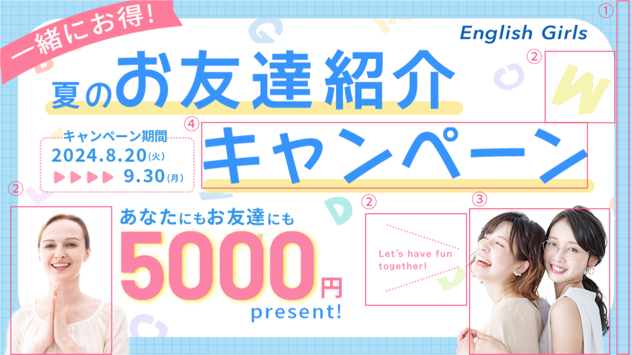 キャンペーン内容がわかりやすいように外国人の先生や友達の写真、背景にアルファベットを入れる工夫などをしているのも素晴らしいなと思いました。