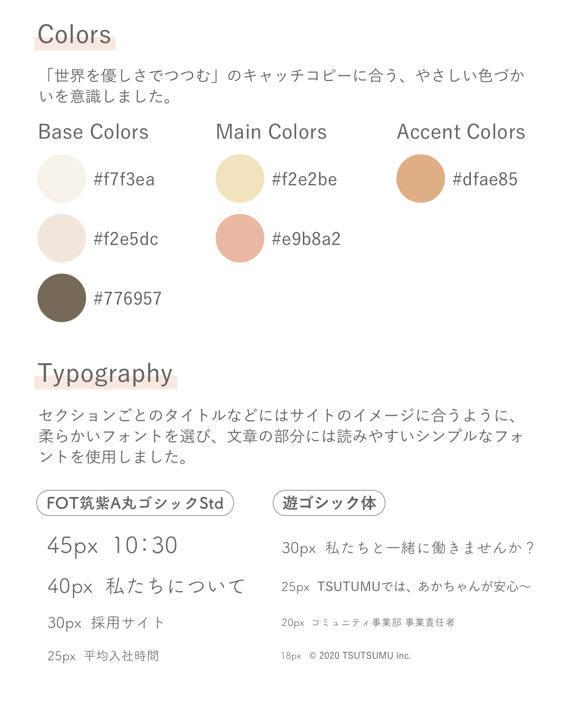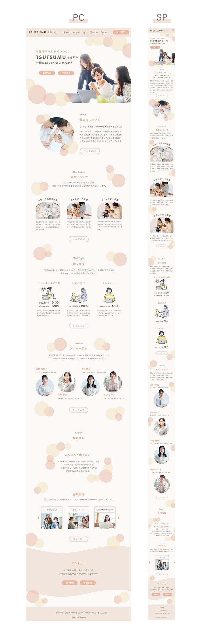 事業内容がわかりやすくなるように赤ちゃんや家族の写真を入れつつも、採用サイトだと理解していただけるようにメインビジュアルには働く女性の写真を配置しました。