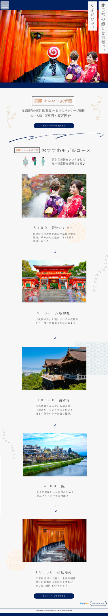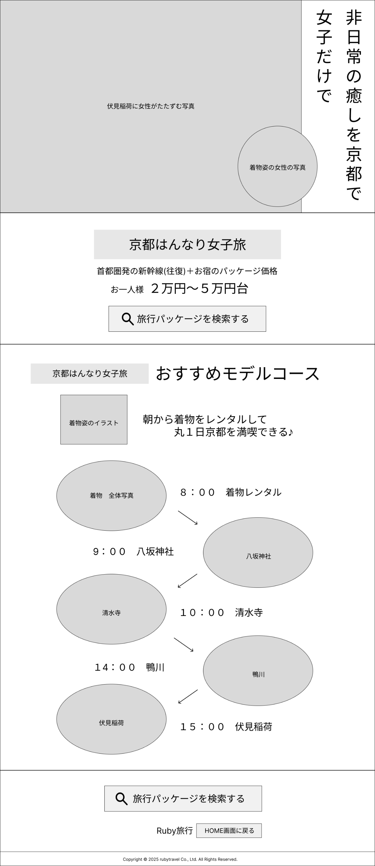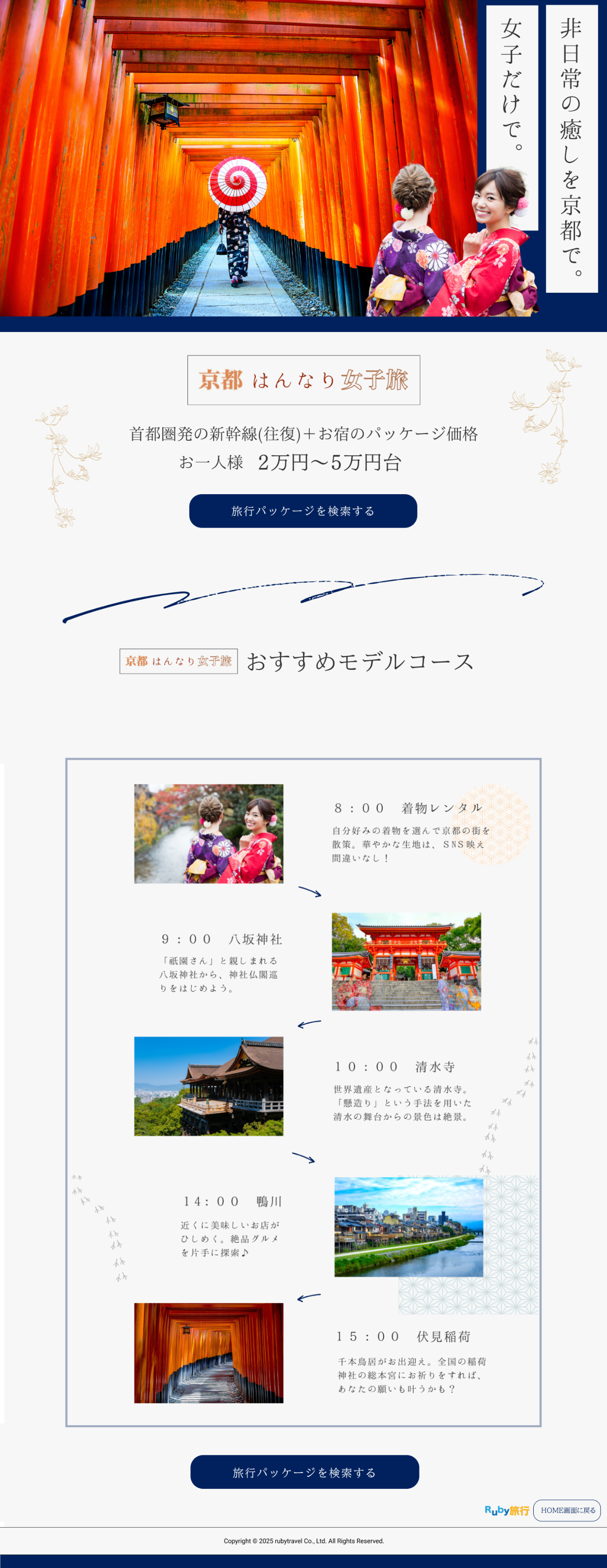 首都圏発の新幹線(往復)+お宿のパッケージプランを販売します。LPでは女性の方に楽しんでいただける京都旅行モデルコースを紹介し、パッケージプランの検索ページに誘導する流れで作成をお願いいたします。本LPへの誘導は、Ruby旅行公式HP内に設置の特集バナーからとなります
