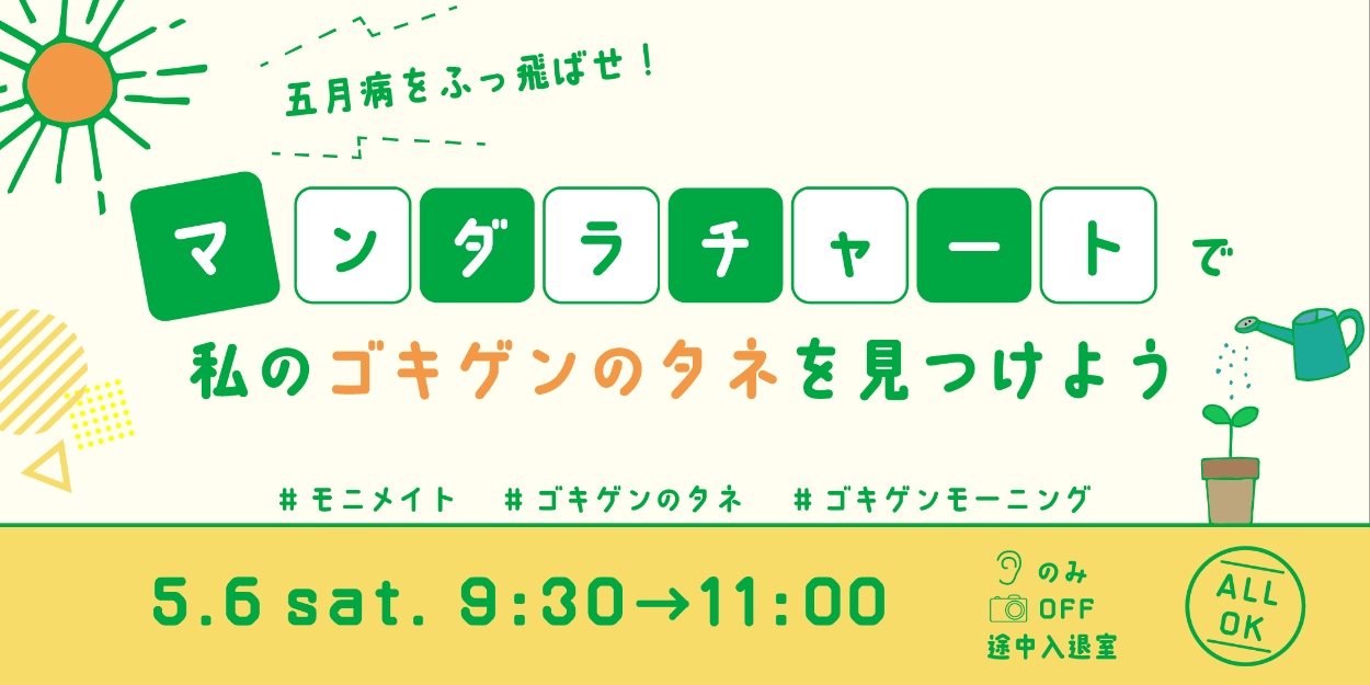 5月の陽気な気候と新緑をオレンジ・黄色と緑で表現。「ゴキゲンのタネ」をイメージできる植木鉢とジョウロのイラストはトンマナに合わせて色を変更しました。また「マンダラチャート」は四角で9マスに区切られた思考ツールなので、四角をタイトルに入れました。