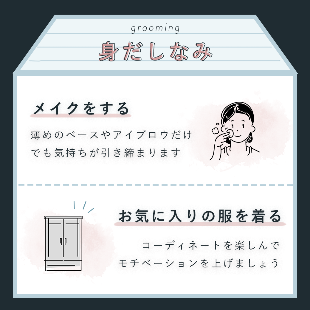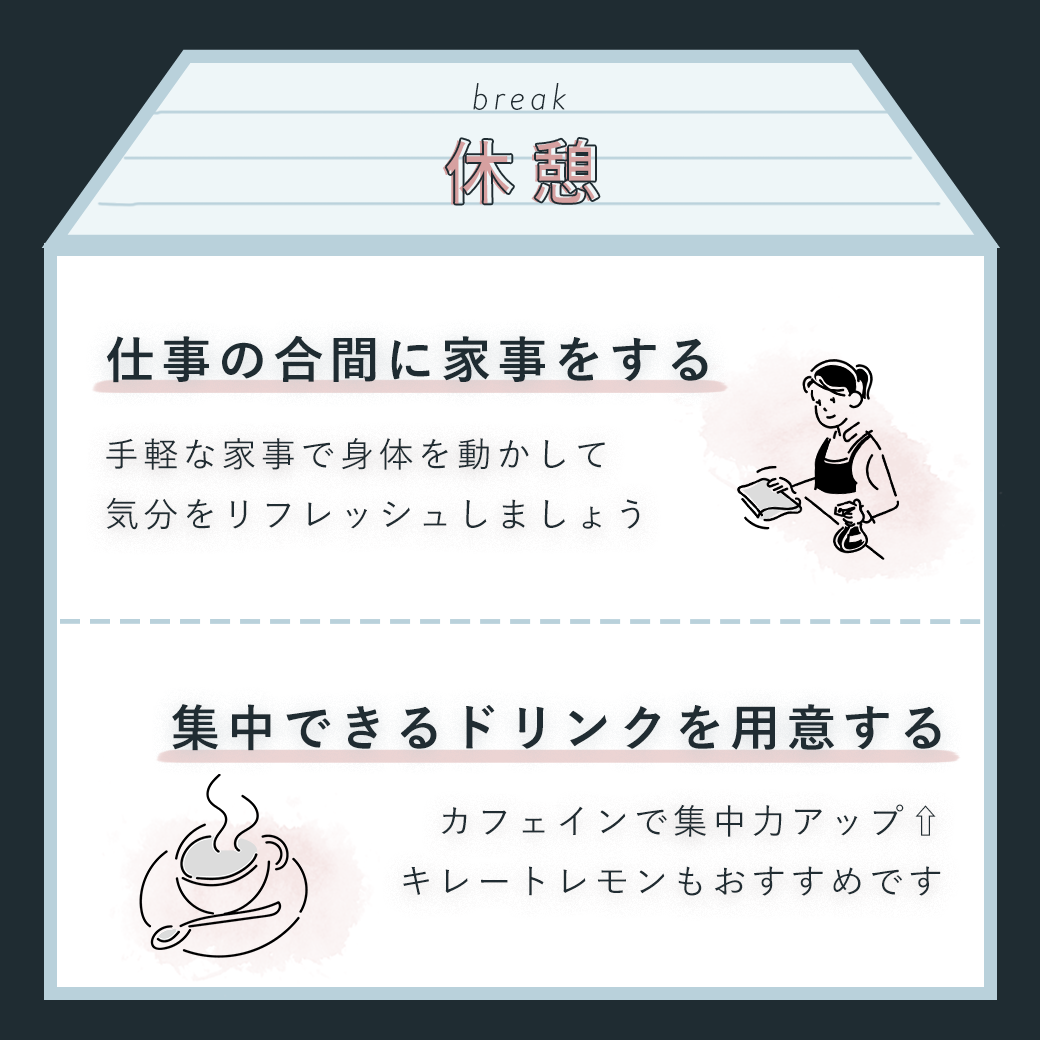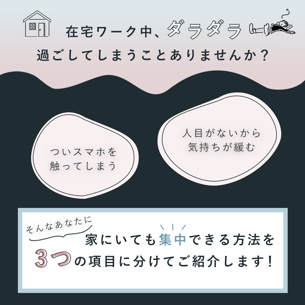 - 上部のなみなみから滴れるイメージで、不規則な楕円形に、在宅ワークにありがちだと思う内容を記載