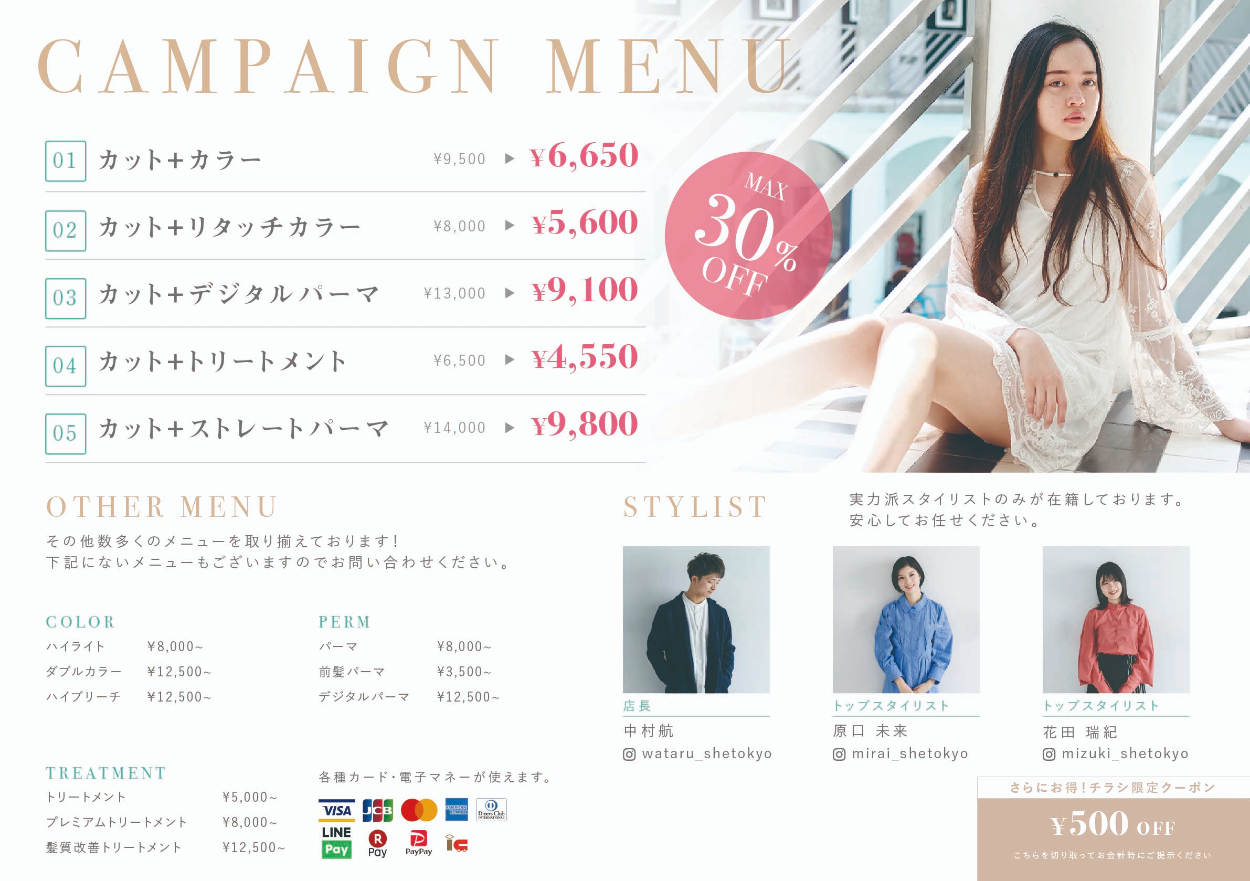 SHElikes MULTI CREATOR COURSEの実践課題としてヘアサロンのオープン記念キャンペーンのフライヤー制作に取り組みました。