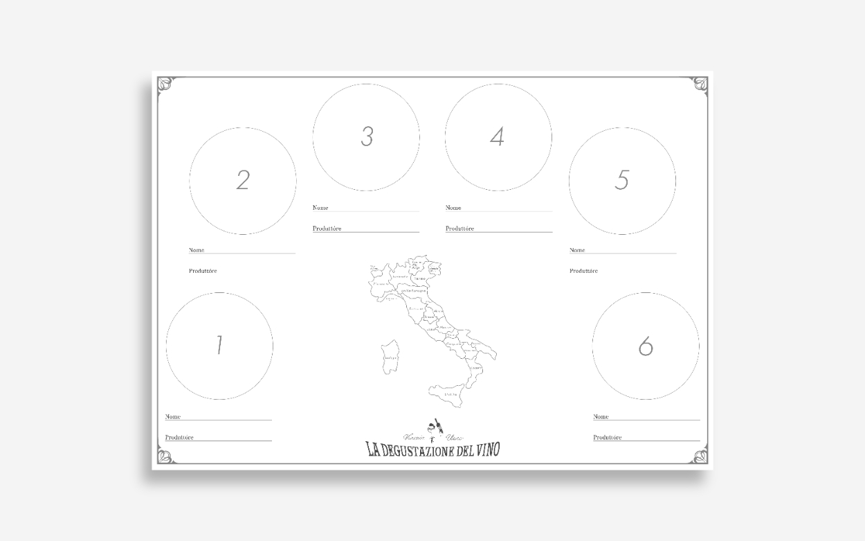 イタリアワインの知識を学びながら、産地ごとの味わいを体験するワークショップでの使用を想定したデザイン。