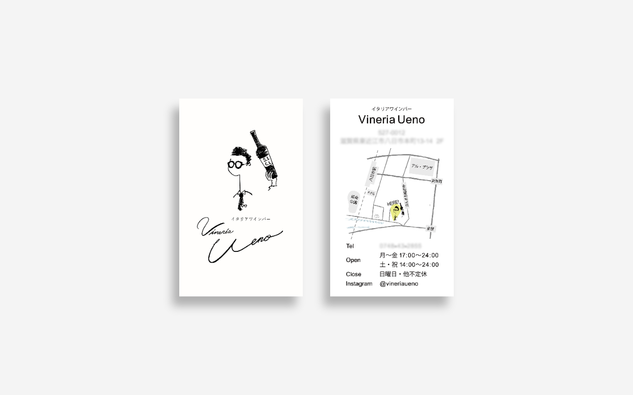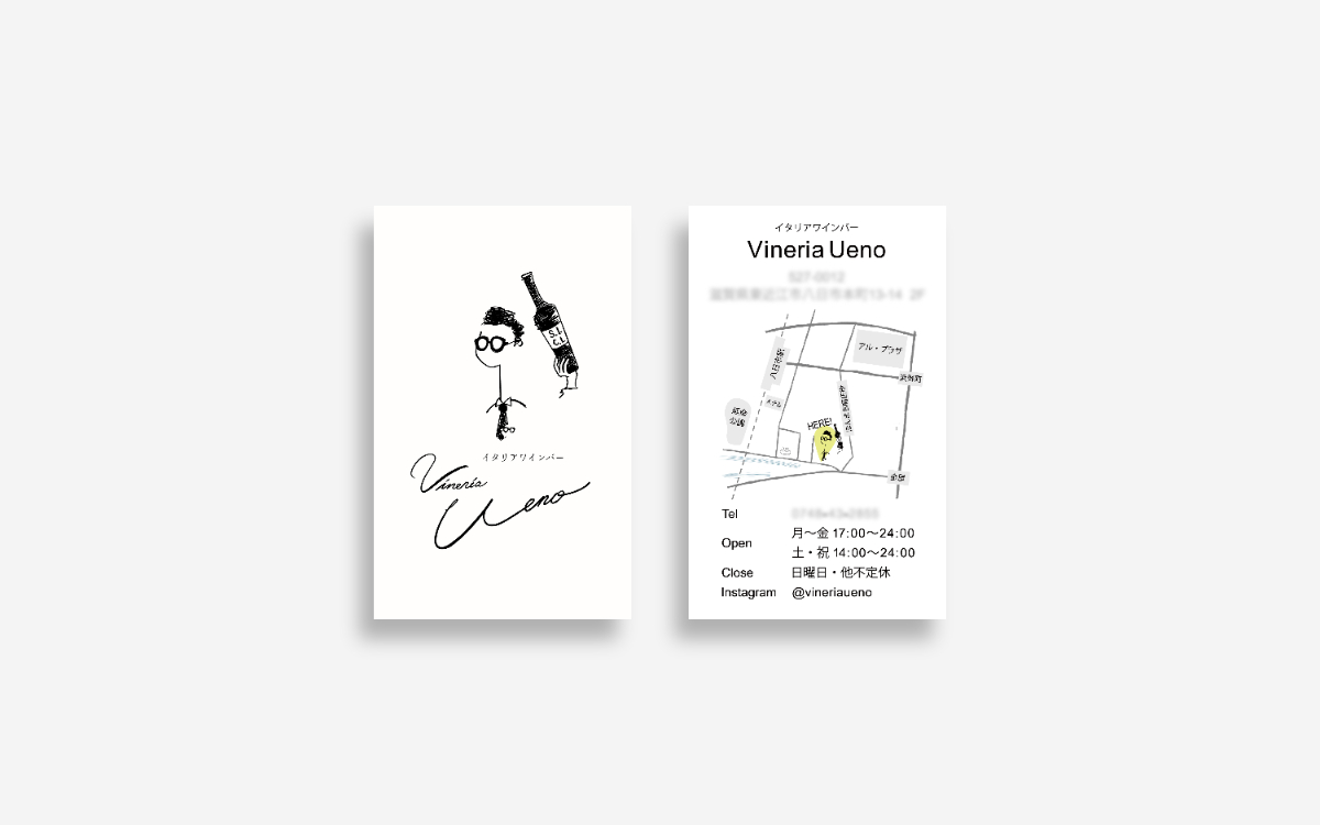 滋賀県・東近江市にあるワインバー「Vineria Ueno」様のロゴ、マップ、ショップカード、テイスティングシートのビジュアル制作を担当。お店の持つ落ち着き・温度感・ワインを楽しむ余白のある時間 を大切にし、手描きのニュアンスを活かしたロゴを軸に、各ツールへ展開しました。