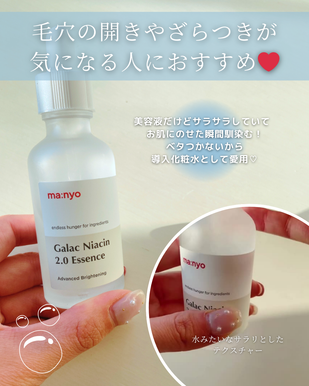 →「美肌美白~」と「くすみ改善~」は読み手が気になる成分表示と使用後の効果内容のため、文字と背景の円を少し大きく配置し目に留まるようにしました。