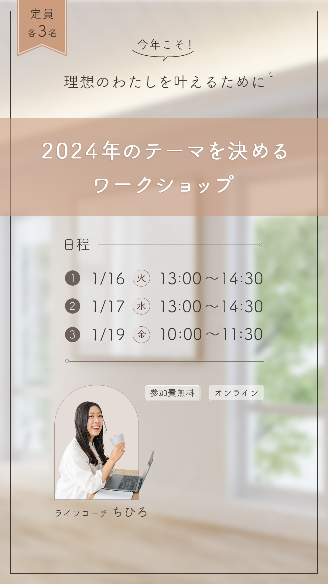 ・ライフコーチと行うワークショップなので、自然豊かな明るいお部屋で、落ち着いてお話しするイメージでデザインしました。