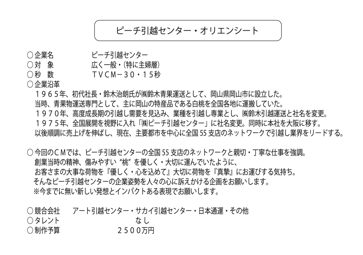 これだけでは引越しセンターより特撮の印象が強くなってしまうと指摘されたため、第二弾として、引越しスタッフの一員として一緒にピーチレンジャーが働いているバージョンを作ることを提案した。