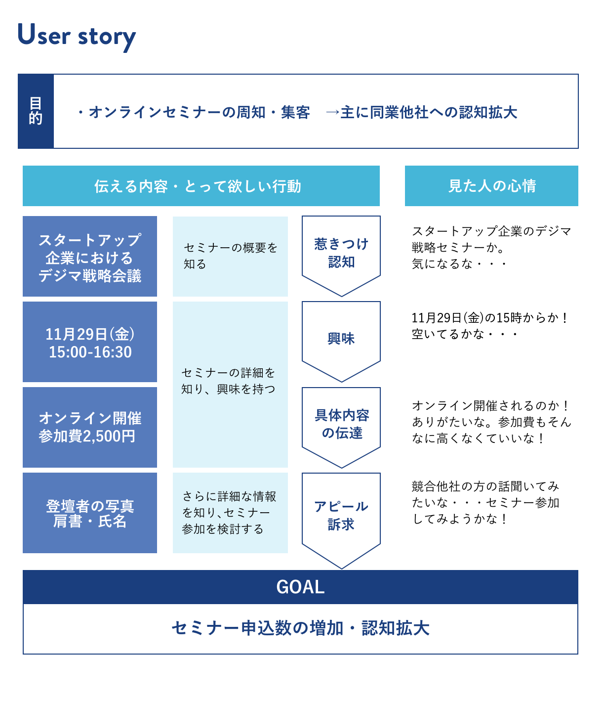 要件から、ペルソナ、ユーザーストーリーを作成し、バナーの情報設計を行いました。