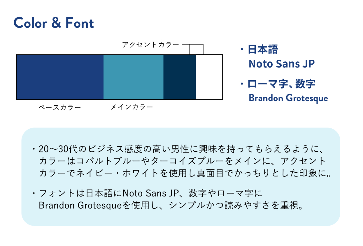 ターゲット層の20〜30代のビジネス感度の高い男性のイメージに合うように、シンプルでスタイリッシュな雰囲気が出るよう、メリハリのあるデザインを作成しました。