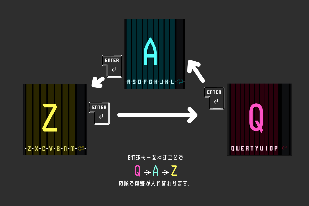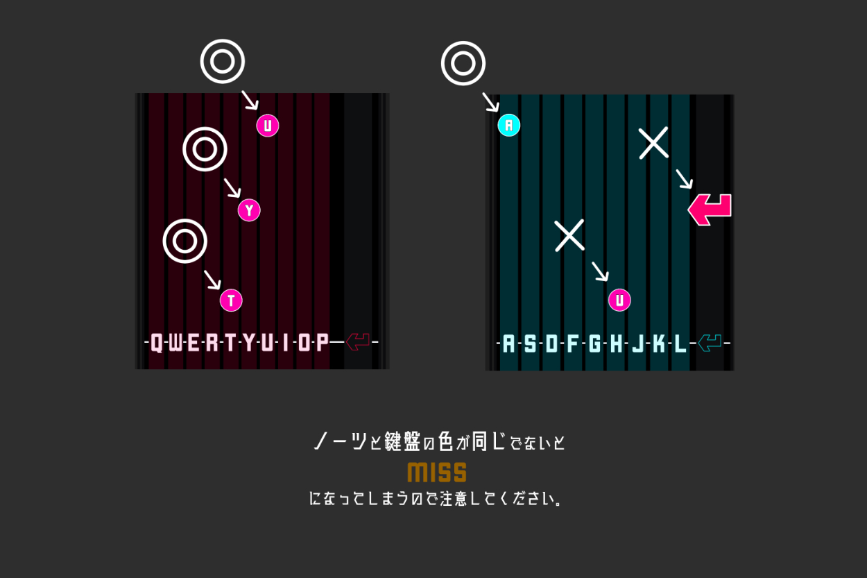 Enterを押してレーンを入れ替え、降ってくるノーツの色とレーンの色が合うようにしながらプレイするシステムになっています。