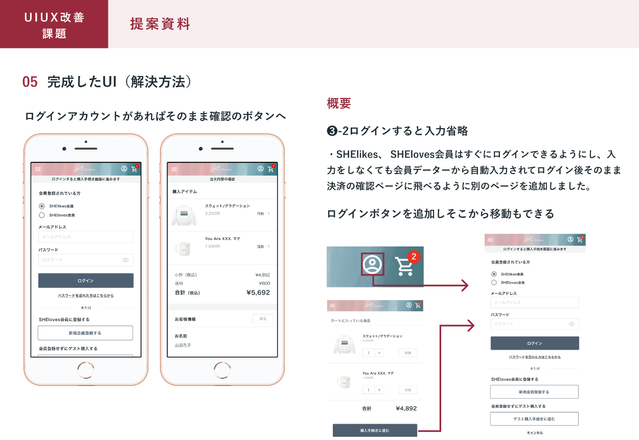 課題の解決としてログインページを追加で作り、ターゲットであるSHElikesの会員 、まだ会員ではないがSHEに興味がある人とどちらもスムーズにお手続きに進めるようなUIを作りました。またSHEの世界観が好きな人へのアプローチとしてバナーなど常にユーザーに情報が早く入り、より世界観がわかるようなコンテンツを上部に持ってくることでページの利用率UPも意識しました。