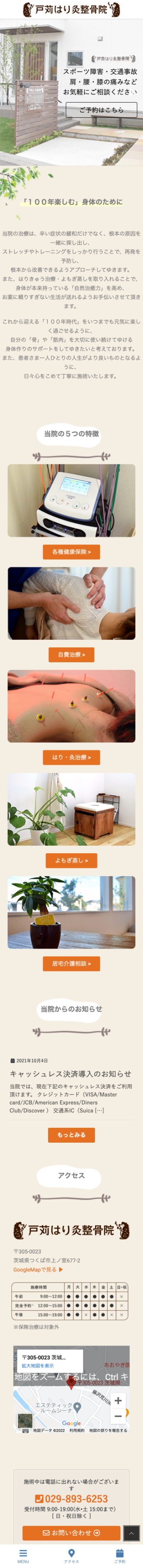 戸苅はり灸整骨院様 HP制作 KOHARU webデザイナー OVERVIEW はり灸整骨院様のHP制作 YEAR 2021 クライアント情報保険治療や自費治療のほかにも、よもぎ蒸しや介護相談も導入している整骨院様。Webサイトの目的新規顧客導入問合せの向上ターゲット20代〜50代近隣に住んでいる方PC版スマホ版