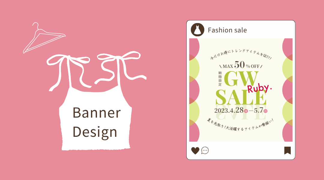 ファッションアイテムや写真を使用していないので、ファッションの系統を伝えるのは難しく感じましたが、こういった文字と図形だけのバナーでも「ブランドやファッションの系統をイメージしてもらえるように」を意識して取り組みました。