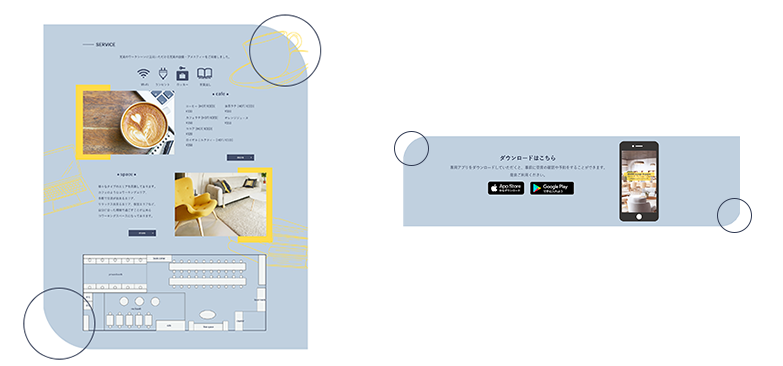 - 「SERVICEセクション」と「ダウンロードはこちらセクション」のブルー背景のカーブはしなやかさを表現しました。ペルソナの川上さんから「しなやかさ」のキーワードを連想したため、しなやかマインドを持つ女性たちのコワーキングスペースと考えデザインに落とし込みました。