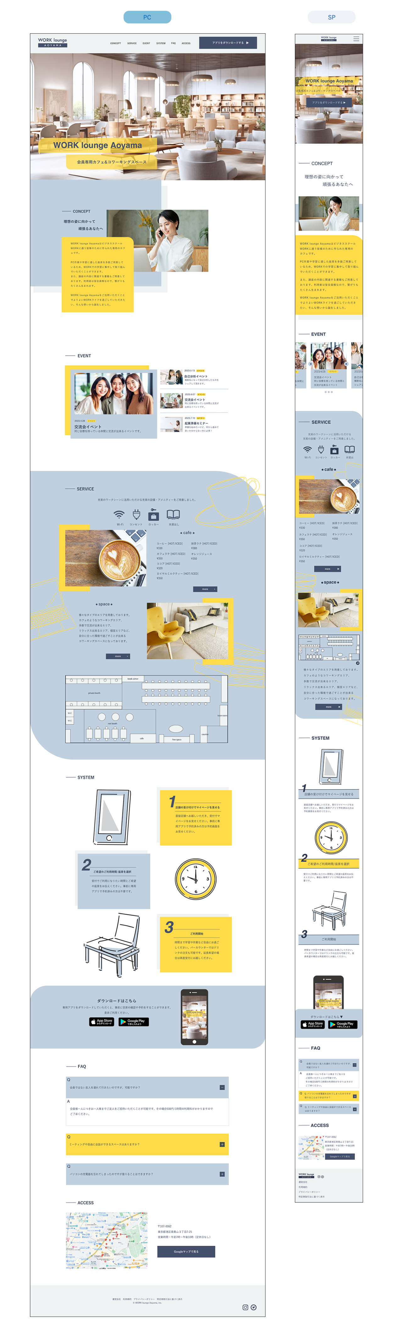 会員様限定のカフェ&コワーキングスペースをオープンすることになり、利用方法やアクセス情報を載せたWebサイトを制作したいと思っている。