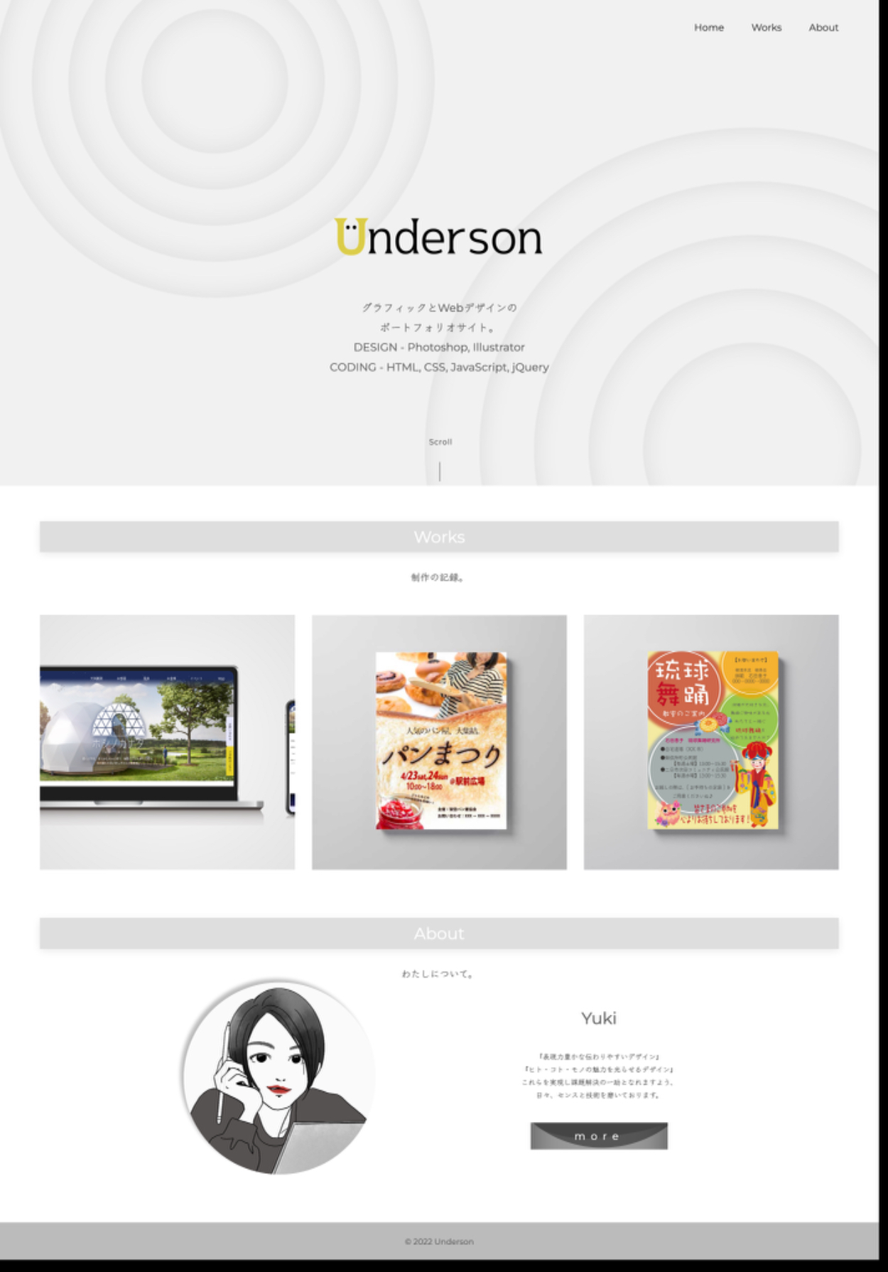 - 制作物を見せるサイトなので、色味はモノトーンを基調とし、ポイントにゴールド系のイエローを配置ました。