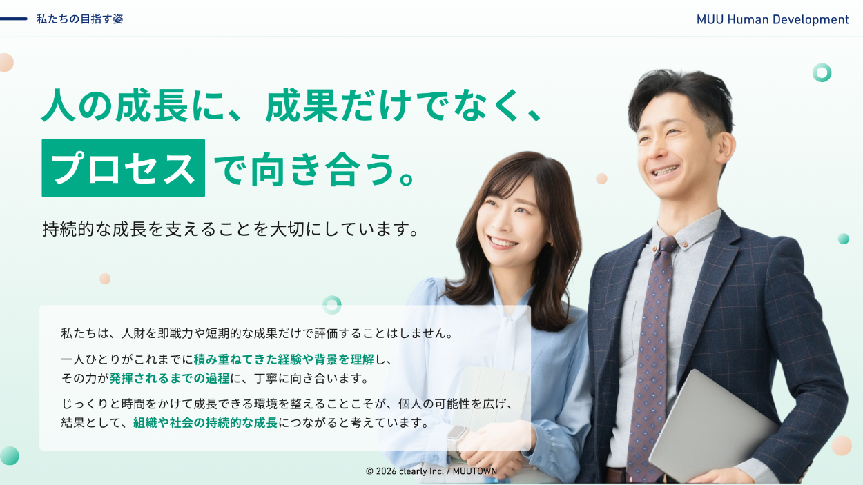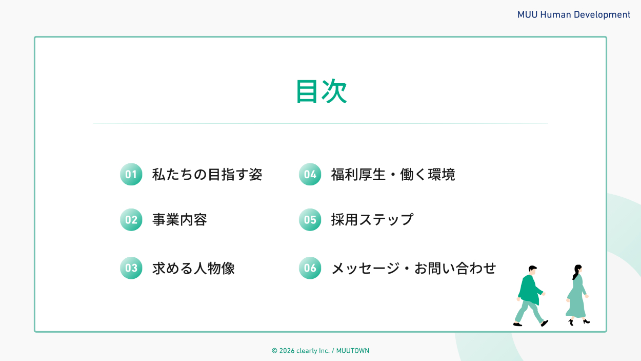 目次は余白を活かしたデザインにしました。企業の特徴である「成果だけでなくプロセスに向き合う丁寧さ」や、「長期的に取り組む心のゆとり」を表現しています。右端にはアクセントとして歩く人のイラストを添え、プロセスという道のりを歩む姿を表現しました。