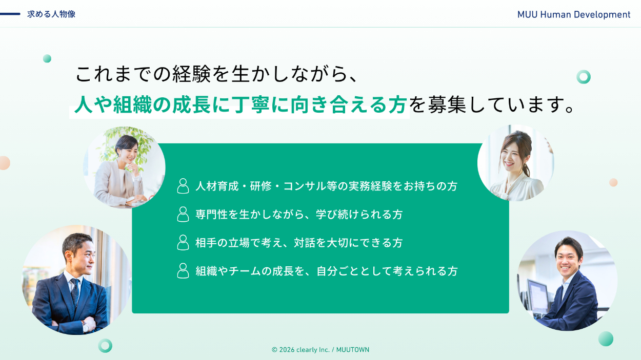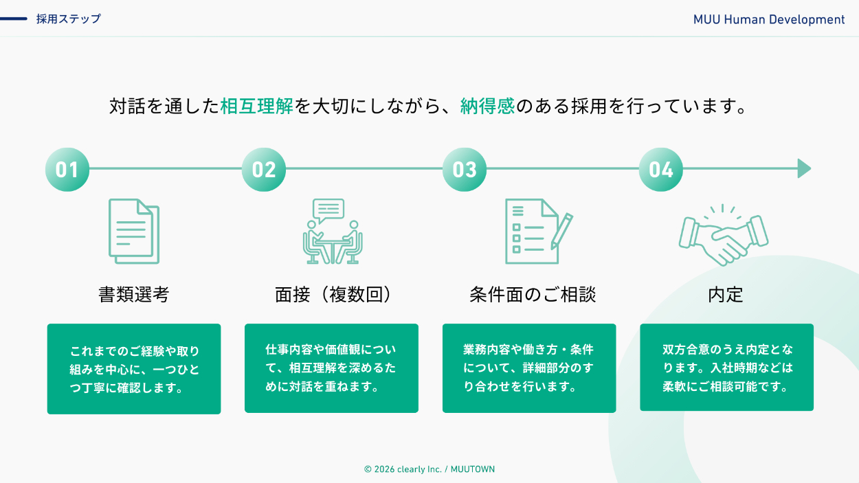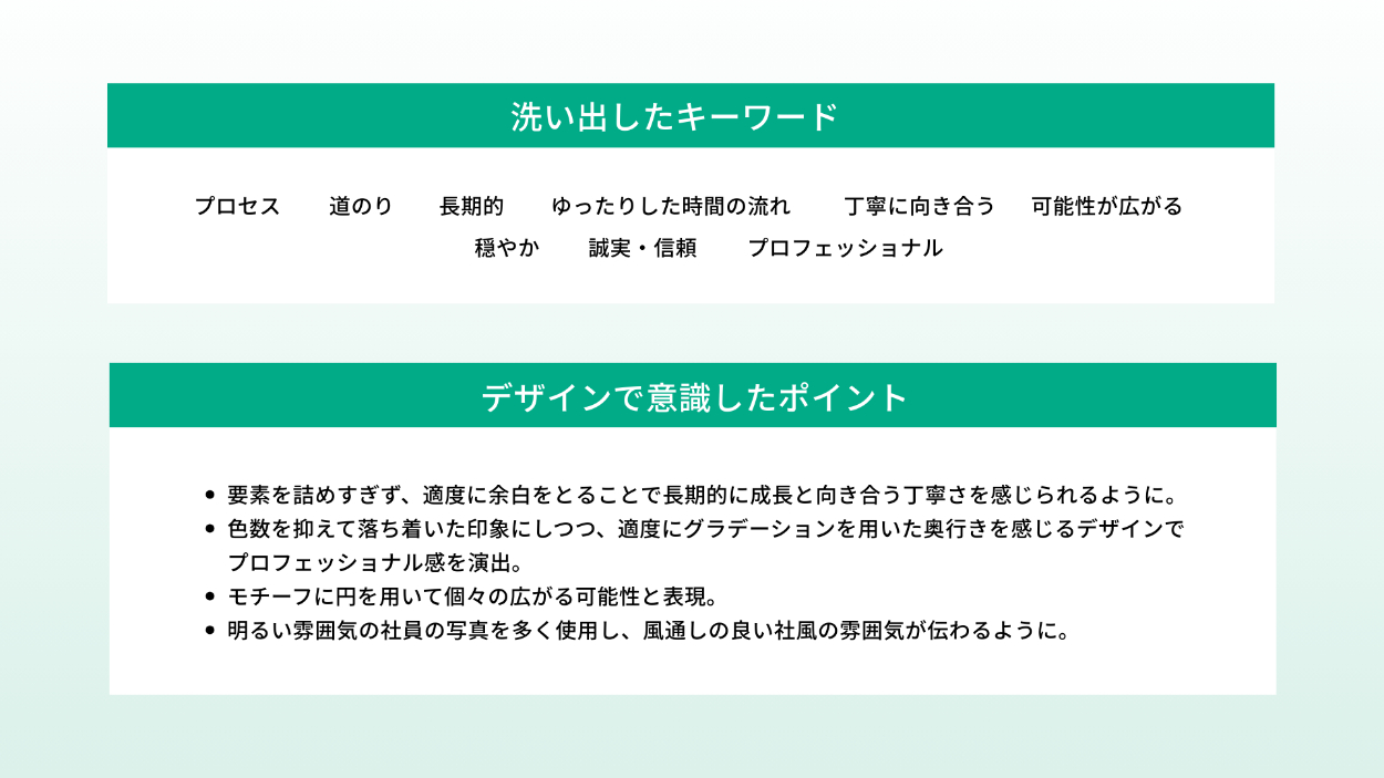フロー図で示し、採用ステップであることが瞬時に伝わるデザインにしました。ページの中でも各ステップの補足事項は、求職者と丁寧に向き合う姿勢が示されており、読み手にぜひしっかり読んでほしいポイントだと感じました。そのためページの中で最も目立つ配色にしています。