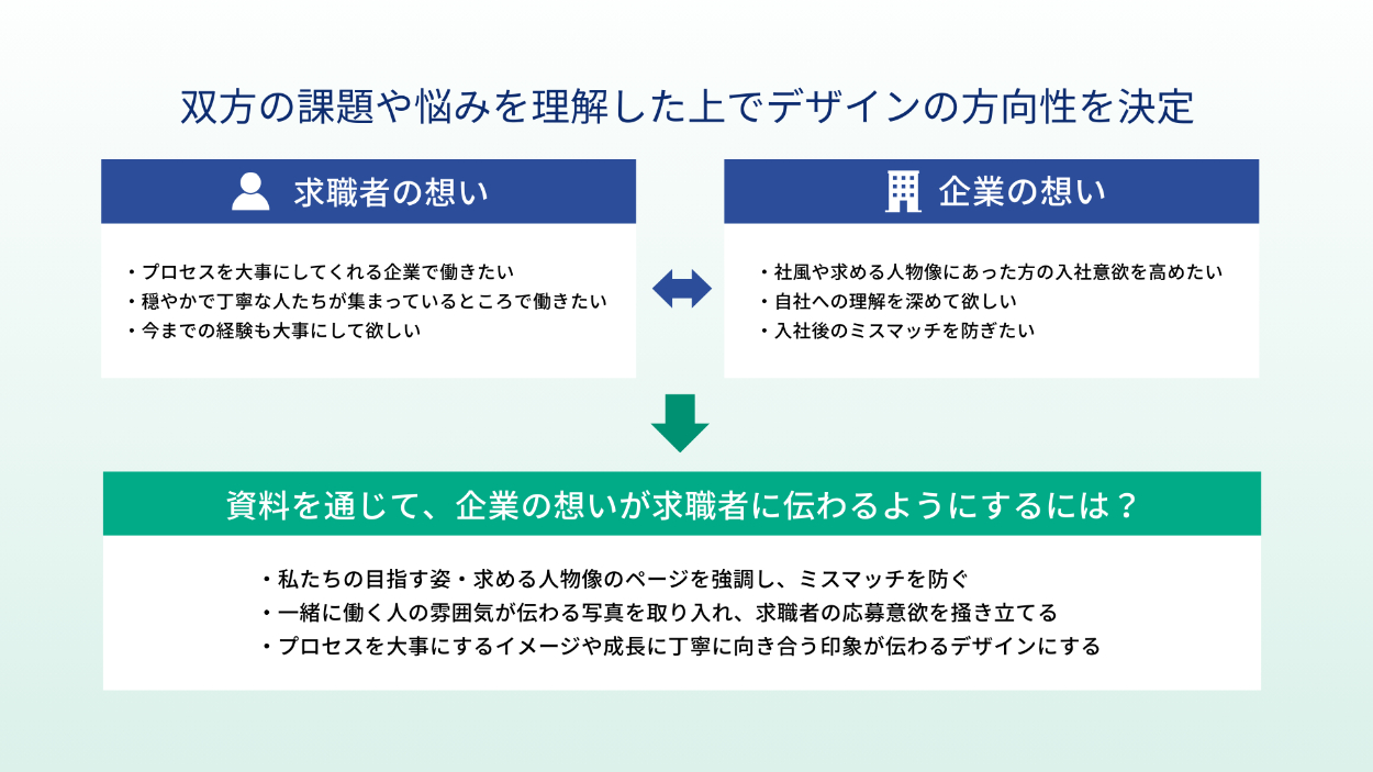 企業と求職者、両者の課題を理解し、解決できるようなデザインに落とし込みました。
