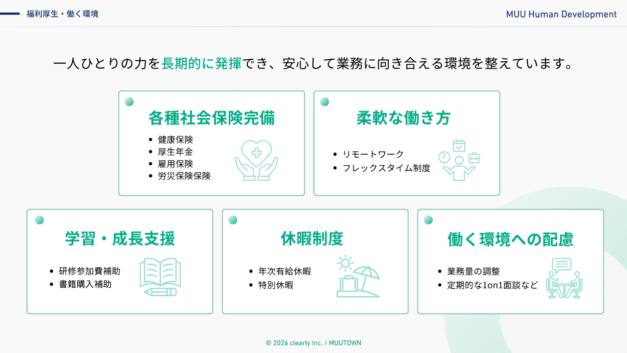 それぞれの内容に合ったアイコンを使用し、働く環境の良さが直感的に理解できるようにしました。