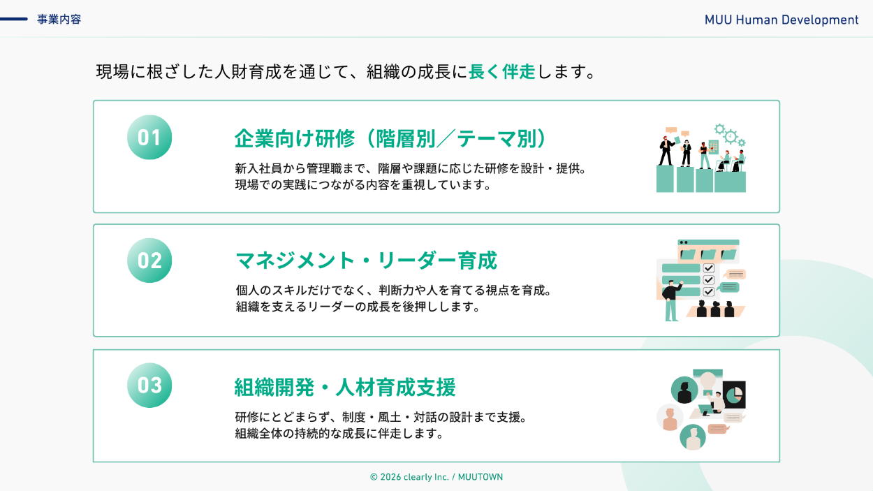 ブロックを積み重ねたような配置にすることで、各事業内容を取り入れていく中でお客様がステップアップし、成長を重ねていくイメージを表現しました。各事業内容はナンバーとイラストととの間に余白を設け、一番伝えたい文に目線がきちんと向くようにしました。
