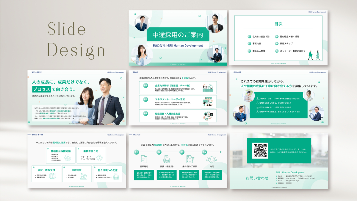 資料デザインコミュニティのお題をもとに、採用資料(人材開発会社)のデザインを制作しました。文章のみのラフから要件を元にデザインに起しました。デザインイメージ:誠実さ・信頼感・プロフェッショナル感
