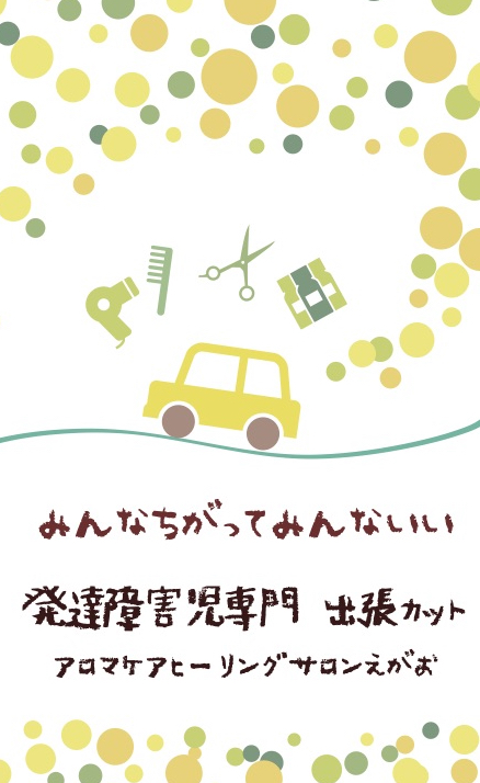・出張カットのお仕事の内容が一目で分かるよう、シンプルなアイコンで表現しました。ご本人がお好きだというイエローをベースに、アクセントカラーにグリーンを使用。