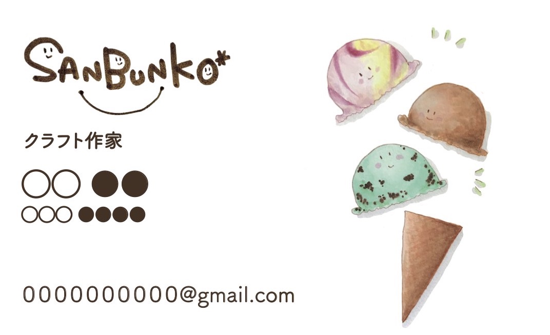 絵の得意な方で、表面はご自身で描かれたロゴとイラストをメインに、裏面ではショップ名の由来と作品の画像を配置しました。