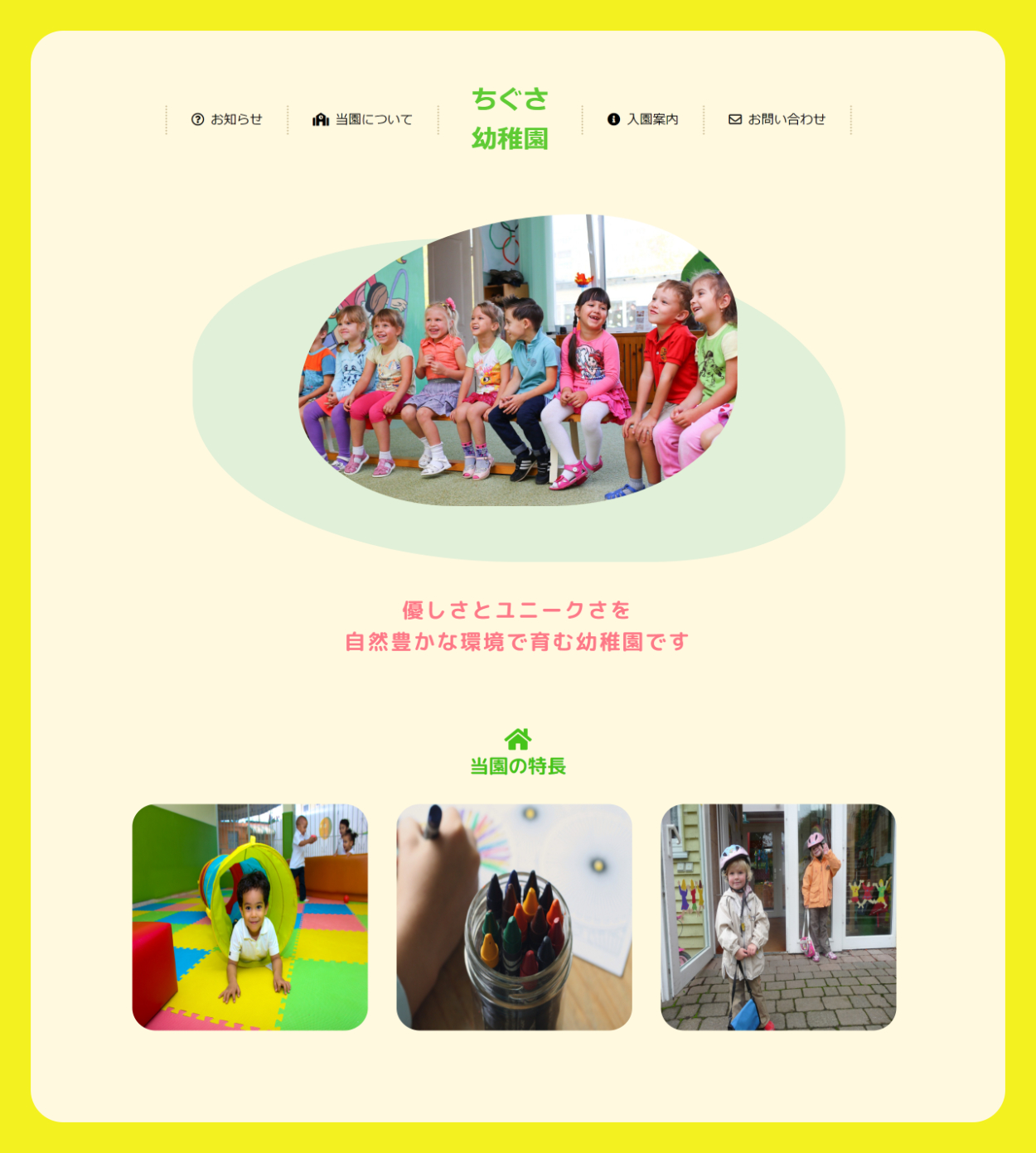 幼稚園ホームページ 山下理香子 webデザイナー OVERVIEW 模写コーディング HTML/CSSを使用して、psdデータを参考に架空のwebサイトを作成しました。画像はpixabayのフリー素材を使用しており、不規則な形の要素を重ねることでユニークさを演出しました。