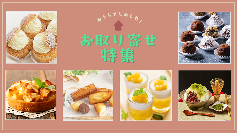 - 文字を中央に置き、指定されたスイーツの写真がそれぞれ均等に見えるように配置しました。
