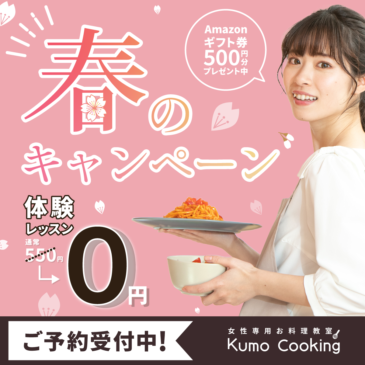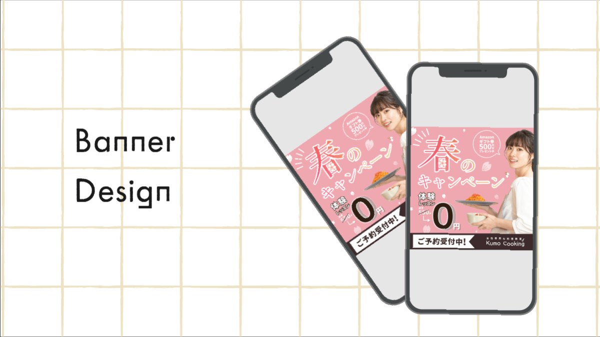 お料理教室春のキャンペーンバナー 片山 グラフィックデザイナー OVERVIEW スクールの課題で制作しました。 女性専用お料理教室の春のキャンペーンバナーを制作しました。一目見てターゲットがわかるよう、女性の写真を使用し、春らしい温かみのあるピンクを使用しました。