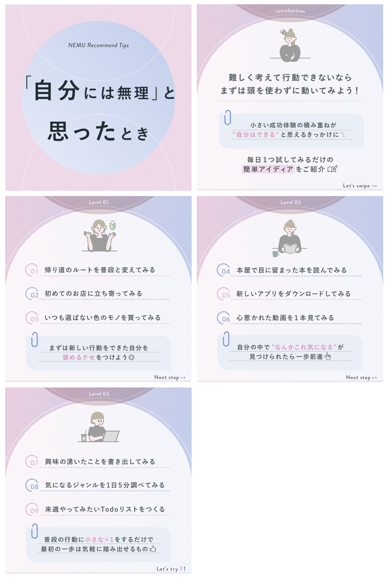 - 内容:「どうせ無理」と感じるときは最初の一歩を踏み出すのが難しいため、