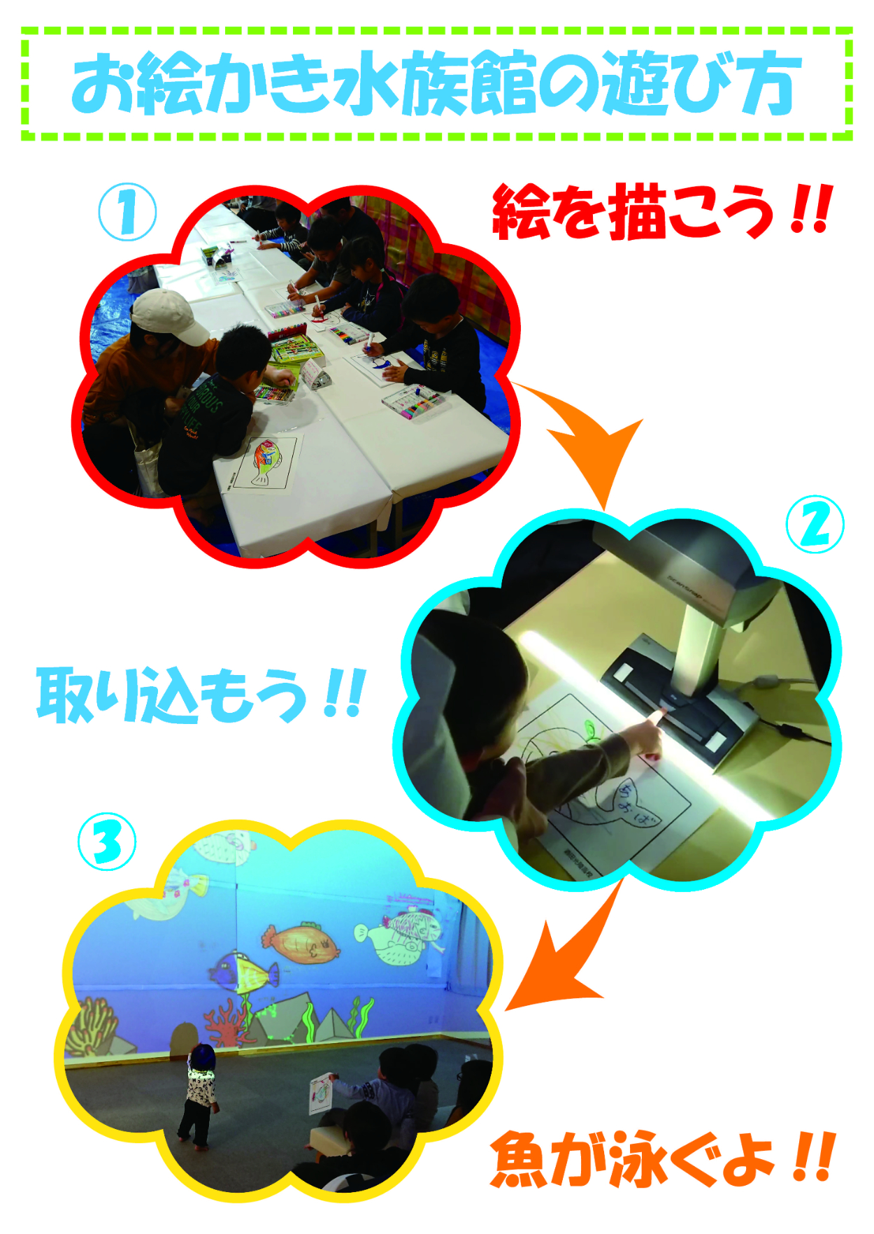 メインターゲットは地域の児童であり、魚の絵が取り込まれてスクリーンの海を泳ぐという内容である。