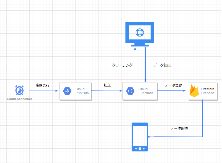 ※サイトスクレイピングは日時で定期実行して最新データを取得する(Cloud Scheduler,Cloud Pub/Sub)
