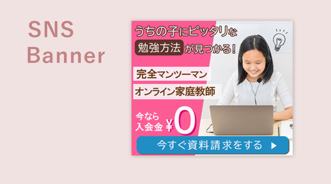 【自主制作】家庭教師_SNS用広告バナー Mayu Webデザイナー OVERVIEW 職業訓練校のバナー制作実習で制作した、SNS用広告バナーです。 YEAR 2024 【目的】オンライン家庭教師、SNS用広告バナー 【使用ツール】Photoshop 【制作時間】2時間【ターゲット】小学生ぐらいの子どもがいる主婦