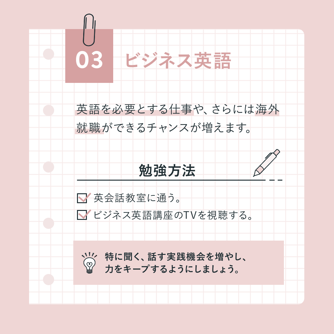 ・制作背景:大人になったからこそ勉強すると良いことを5つ選択し紹介しました。情報設計からデザインまで全て私が行いました。デザインは「SHElikes」様のご指定トンマナに合わせて、ピンクをアクセントカラーとしました。勉強がテーマなので、罫線入りの紙にペンで書き込むイメージで制作しました。
