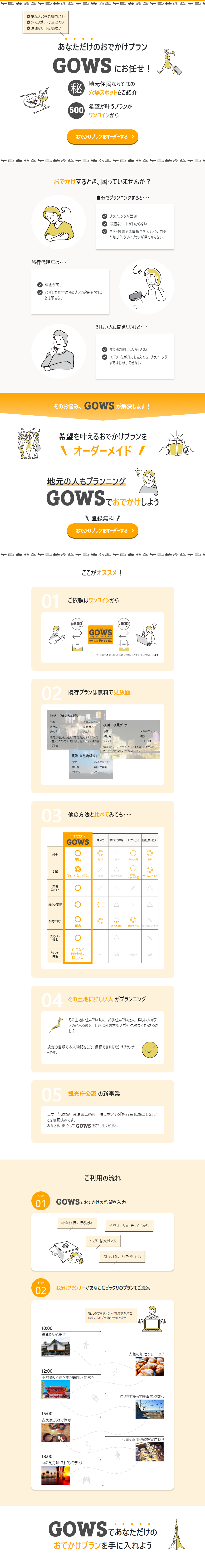 旅行に行くとき、その土地や旅行に詳しい人におすすめを聞くことはありませんか? おでかけやデートのとき、プランに困ったことはありませんか? GOWSは、素敵な旅行やおでかけをしたい人と、プランを考えてくれる人を繋ぐオンラインサービスです。