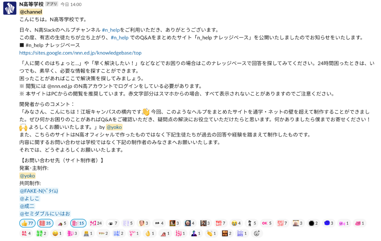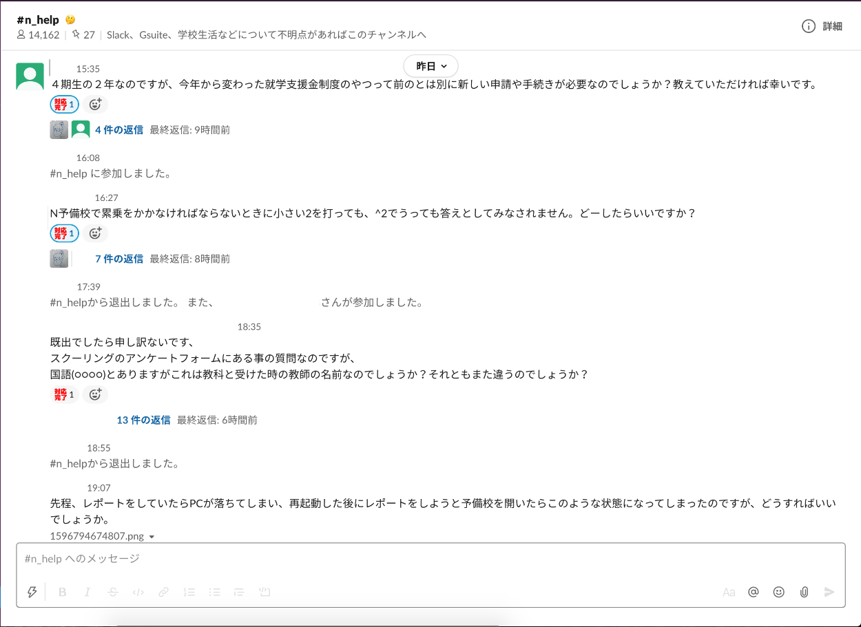 在籍のN高等学校では、Slack を学生/教職員共に利用しています。その中で、#n_help という企業で言うところのヘルプチャンネルやヘルプフォーラムにあたるものが、私達N高等学校の中にもあります。