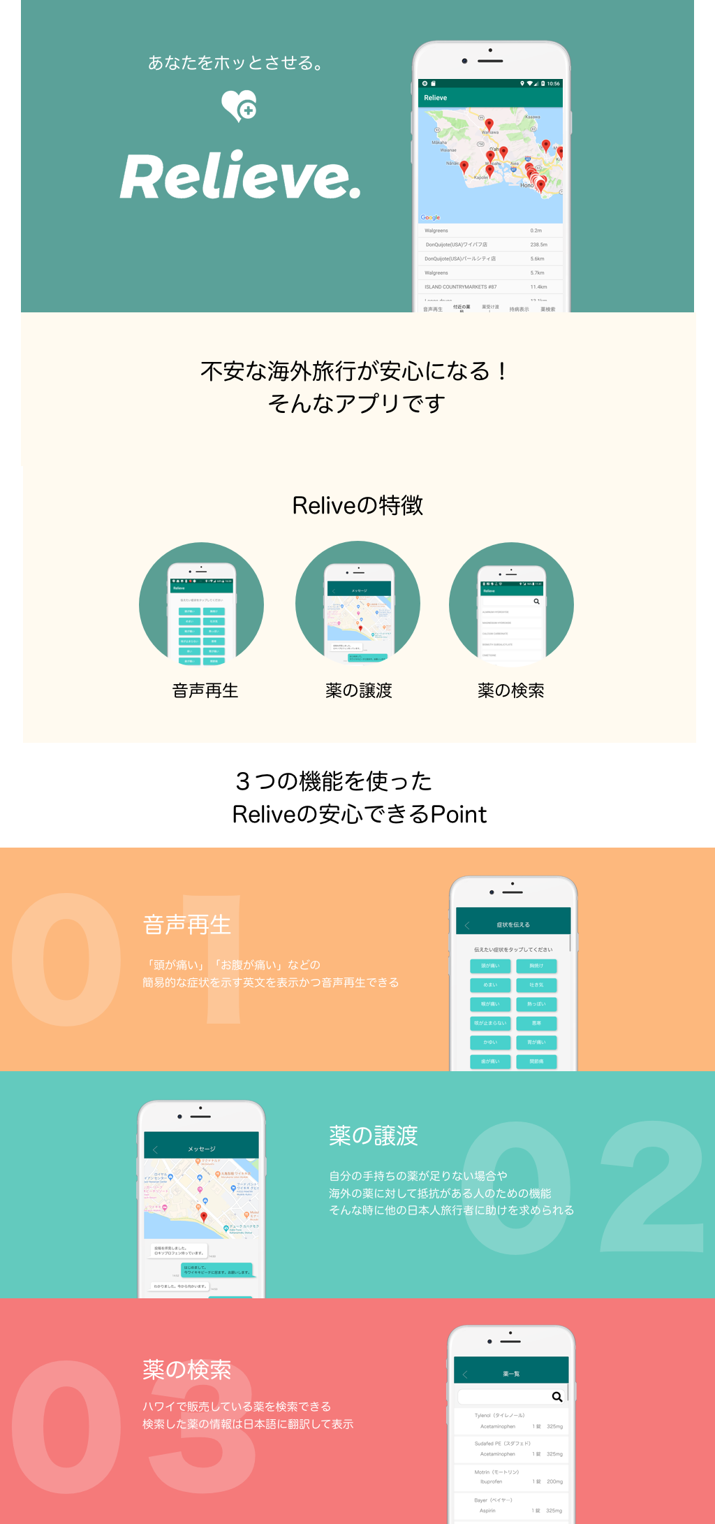 ・作成経緯:グループ制作で海外旅行先での日本の薬を譲渡、検索、音声を再生するアプリを開発していてそのアプリのランディングページのデザインを担当させていただきました。安心するイメージをユーザーに持ってもらう為に色は淡い色を意識しました。