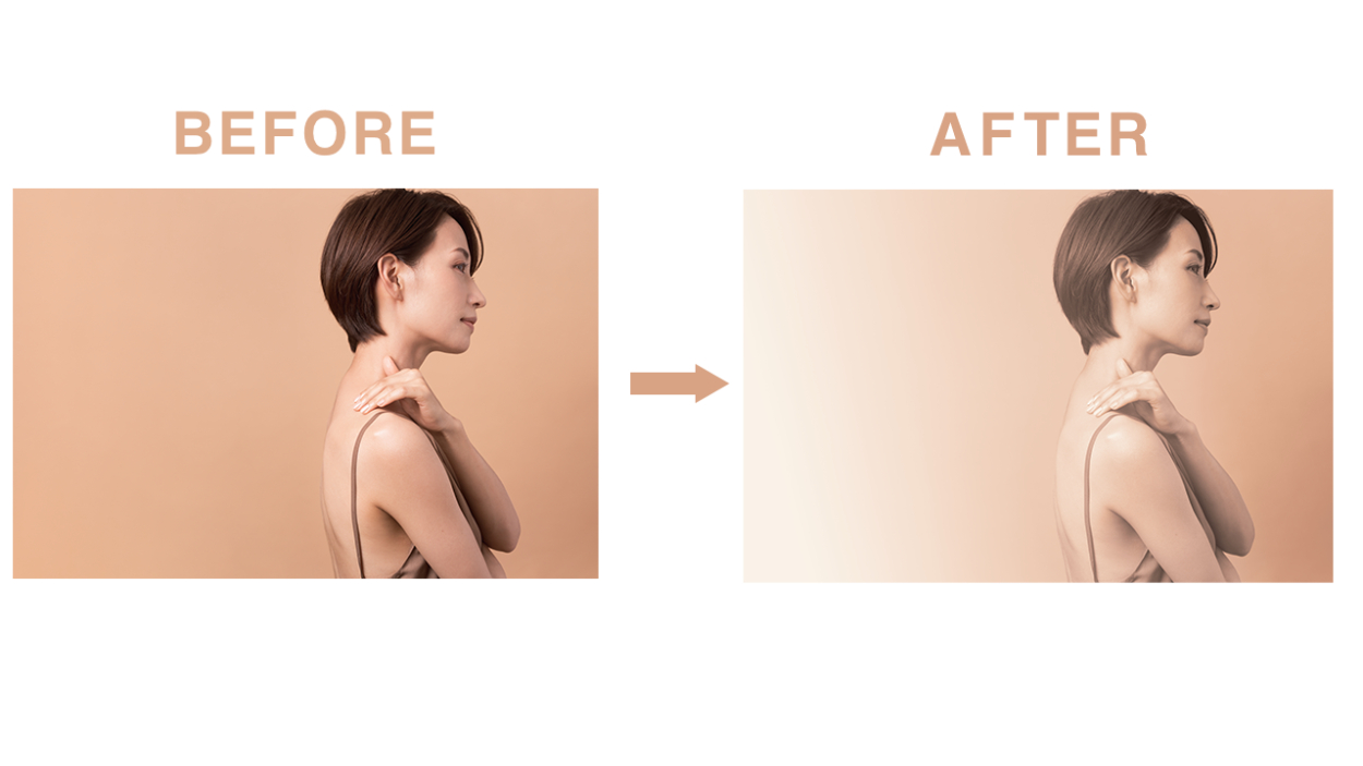 また、少し左から光が当たっているような白いグラデーションで加工しました。これは美容系企業に重要な清潔感と、これから美しさが引き出されていくイメージを与える狙いがあります。