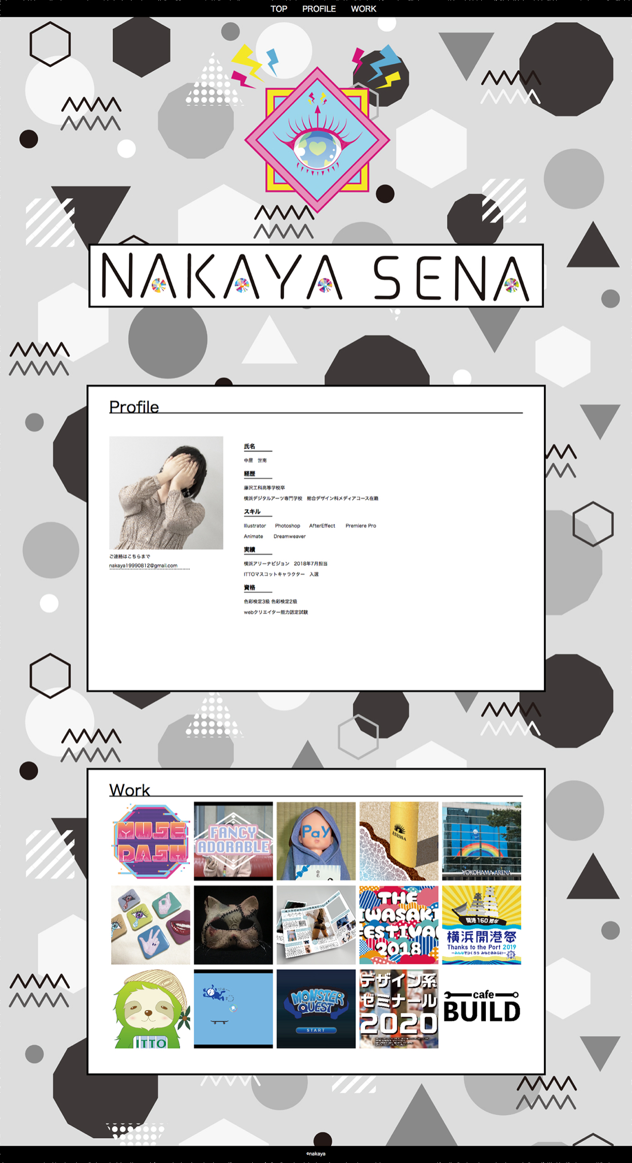 自信をイメージしたロゴを画面の中央に大胆に配置。背景やロゴの主張が激しいので名前の部分はシンプルに、しかし寂しい印象にならないようアルファベット「A」の部分にイラストを入れ全体の雰囲気に合わせています。