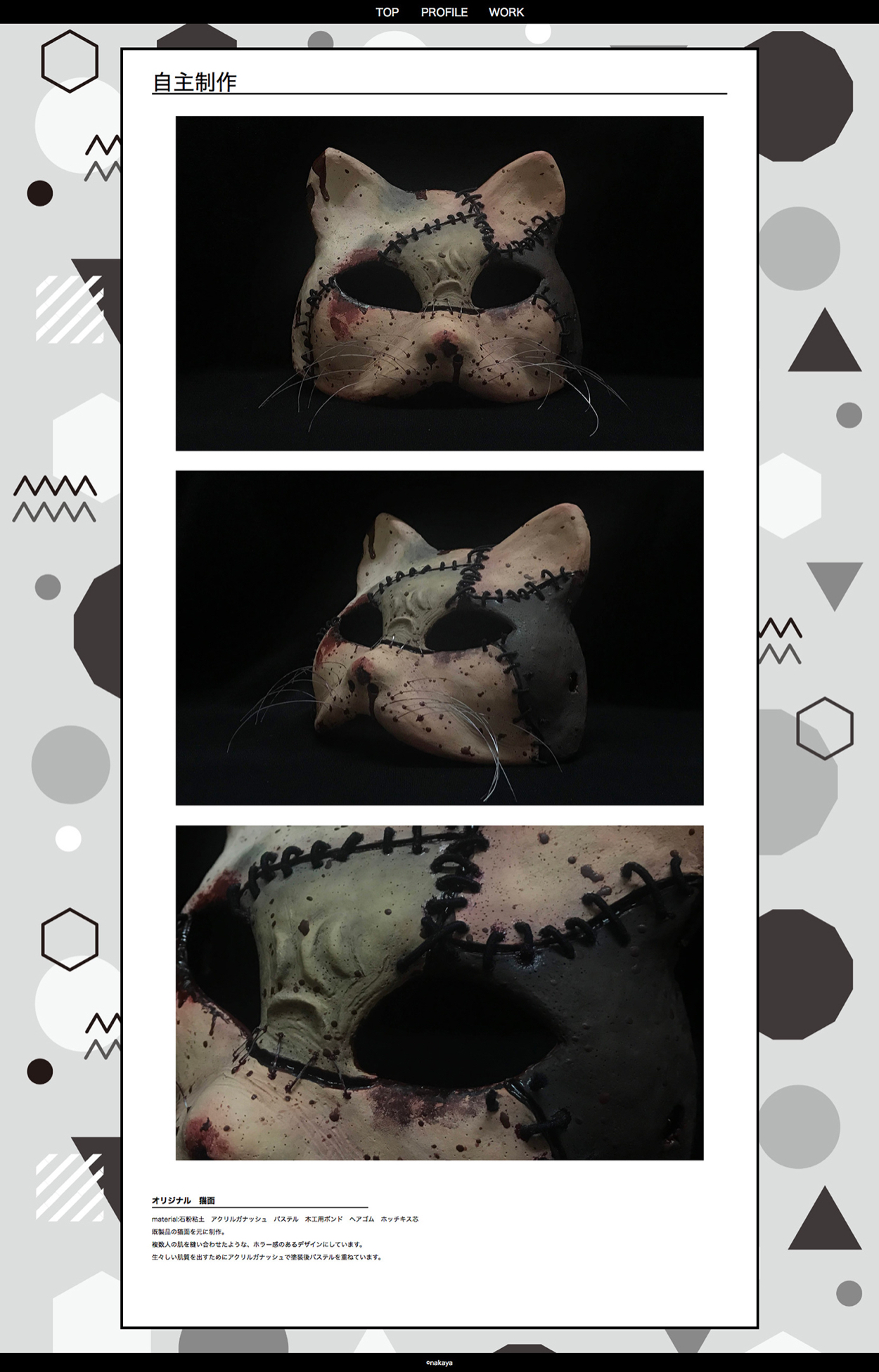 作品わ色鮮やかな物が多いので作品を目立たせるため背景はモノトーン、構成もシンプルにしています。