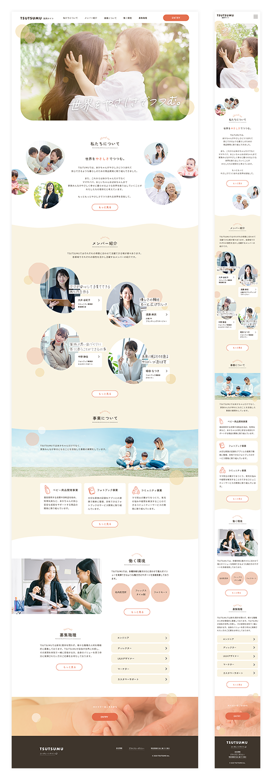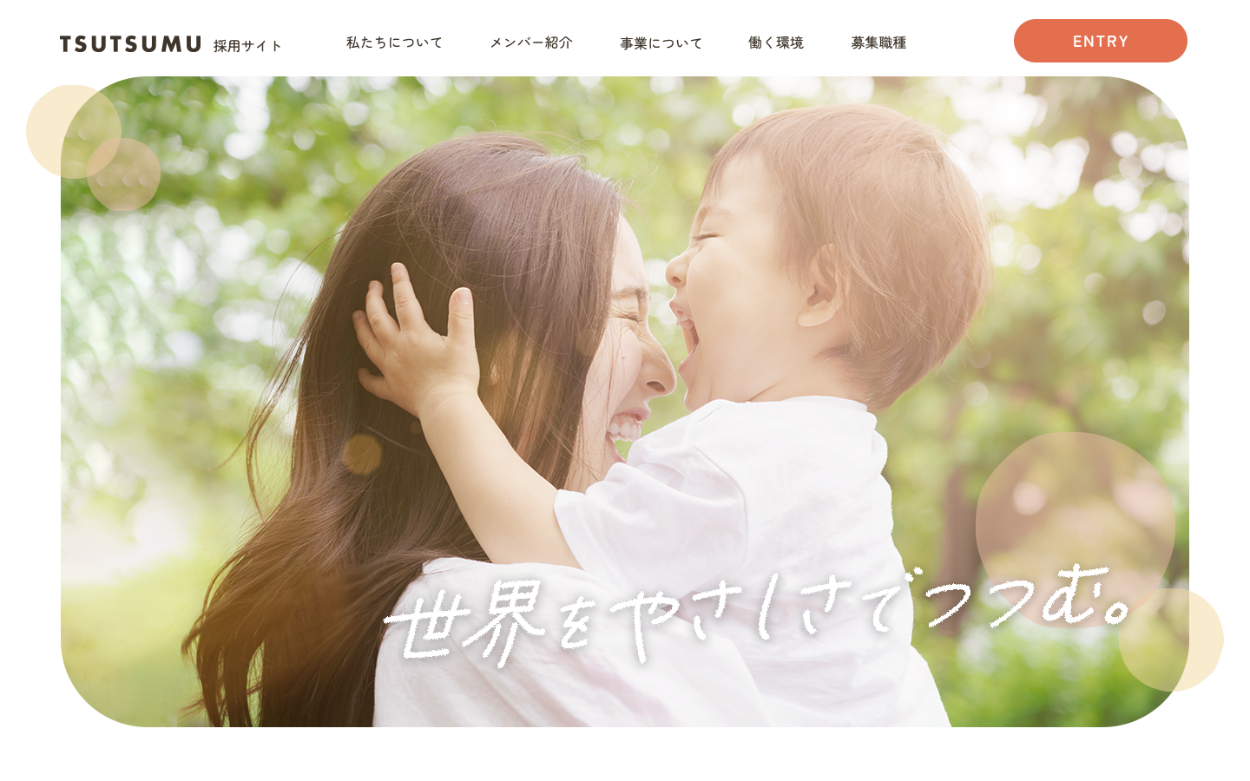 「世界をやさしさでつつむ」というコピーから着想し、企業のイメージが存分に伝わるよう「優しく温かい日差しに包み込まれるような」イメージをコンセプトとして設定しました。そのため具体的に工夫した点は以下のとおりです。
