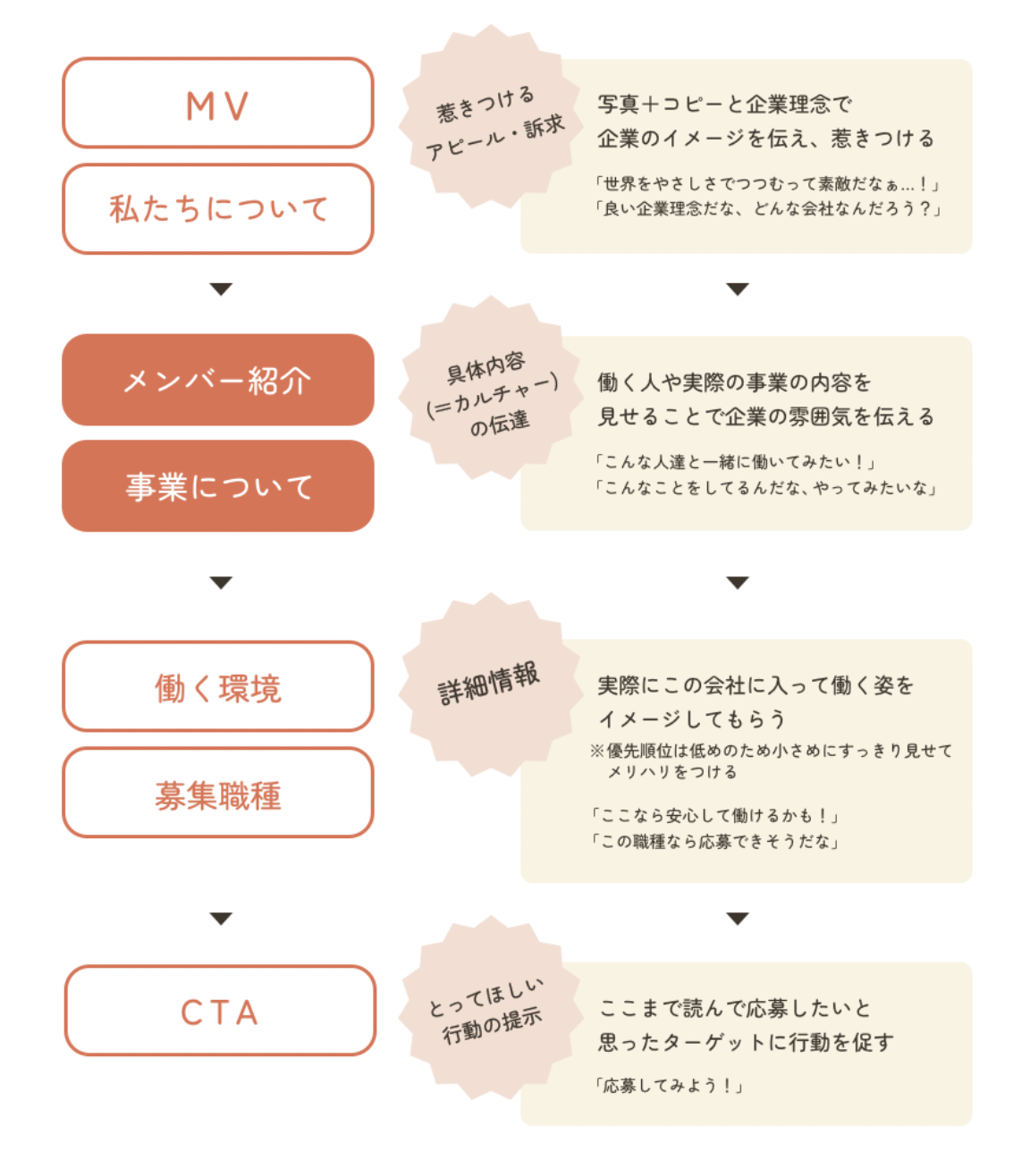 制作目的が「カルチャーフィットする人にエントリーをしてもらう」ことだったため、雰囲気を伝えてエントリーしたい(しやすい)と感じるレイアウトを意識し、以下のユーザーストーリーを想定しました。