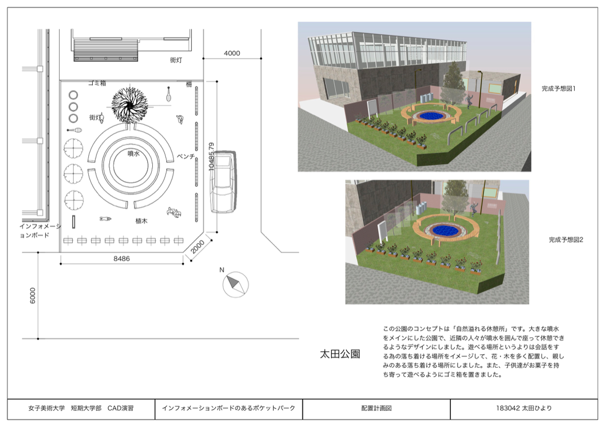 ポケットパーク いも OVERVIEW CAD演習の授業で作成した公園の設計図です。 YEAR 2019 周りに美術館があることもあり、公園というよりは「自然あふれる休憩所」をイメージして作成しました。