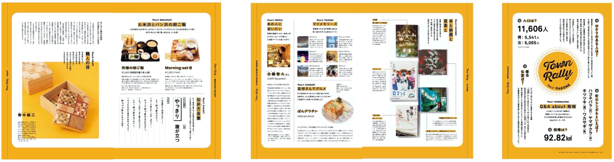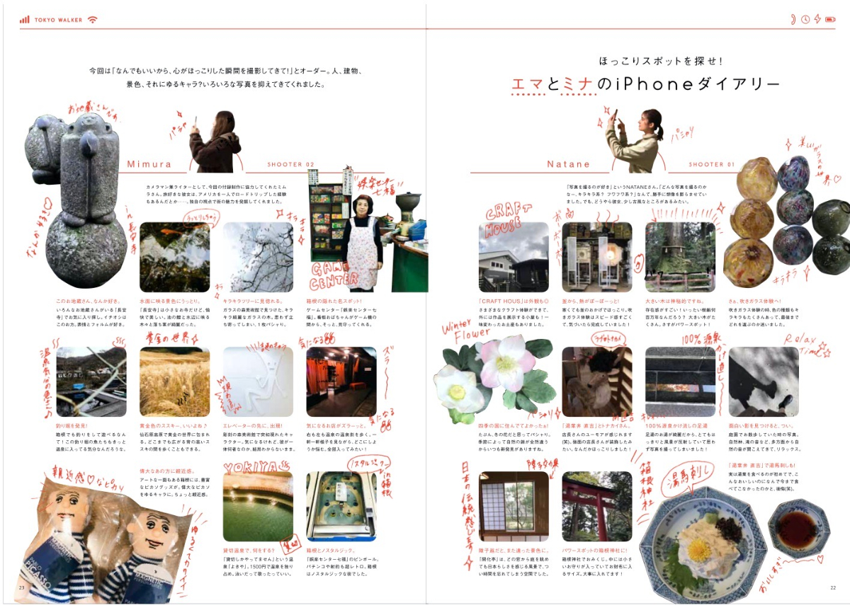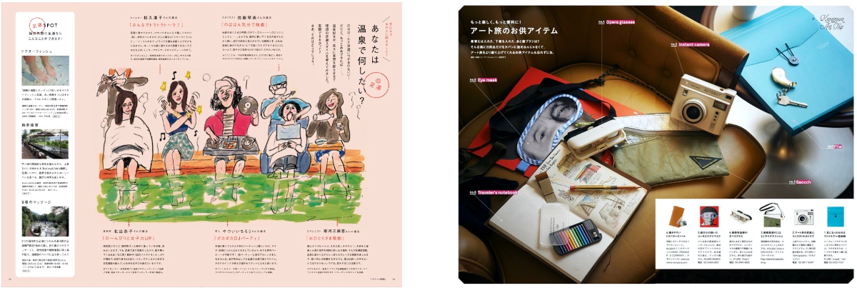 金沢アート旅では美術館巡りなどで使いたいおすすめアイテムを、箱根ほっこり旅では温泉好きが「(なんでもありな)温泉でやってみたいこと」を紹介。また、制作スタッフが現地の取材中に感じた記録を写真と共に振り返るアイフォン 日記も掲載。フランクに楽しめる息抜き企画を組み込む。