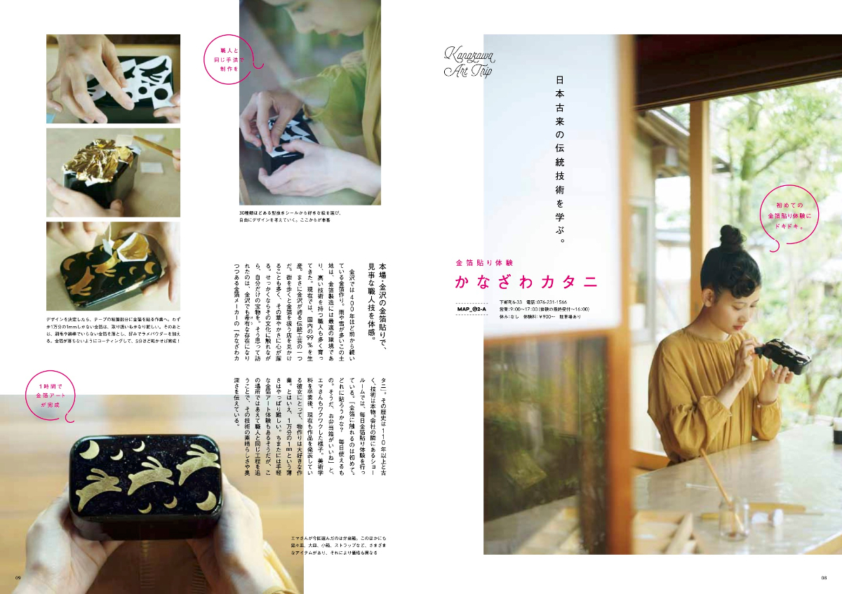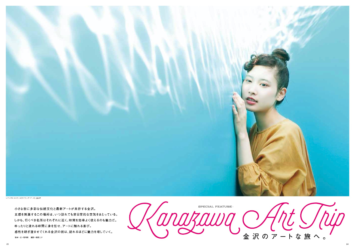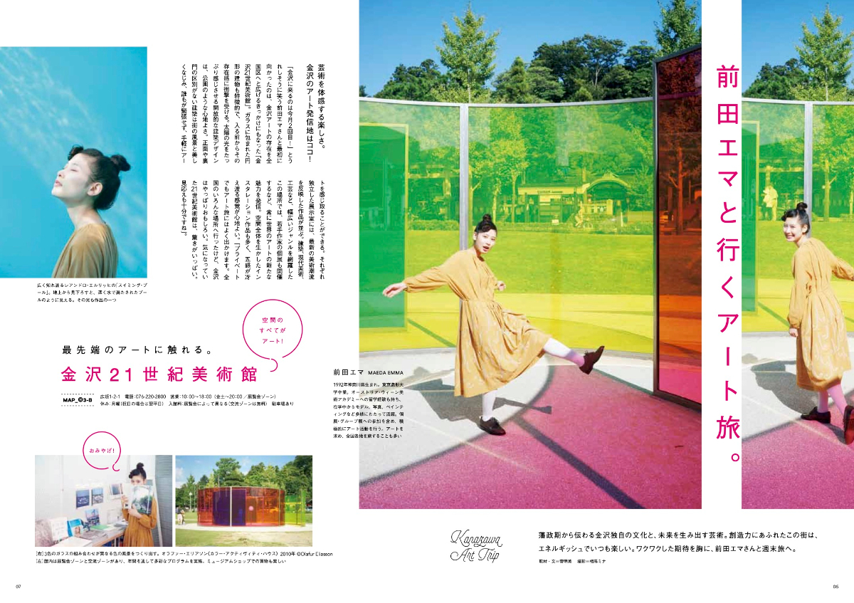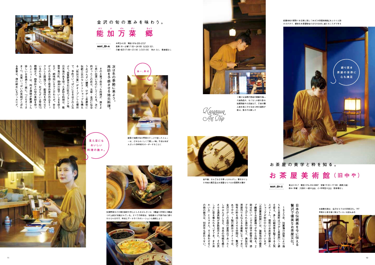 一人のモデルを立てて、金沢・箱根の人気スポットを巡るイントロ企画。テーマにあうイメージ写真を大きく配置し、どのような体験ができるのかを原稿で伝える。美術館、神社、食事処など、スポット(金沢・箱根でそれぞれ4箇所ずつ)でメリハリをつけたレイアウトに。